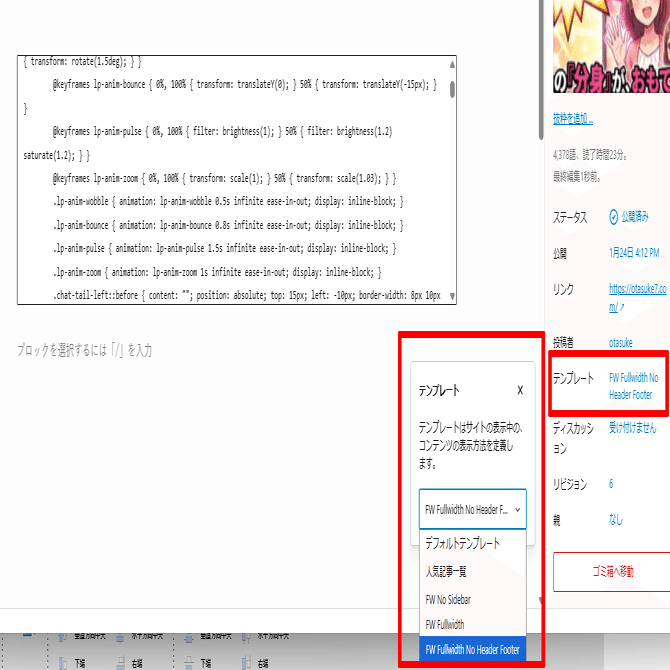 - 画面右側の設定パネルにある「テンプレート」から「FW No Header Footer」を選択します。